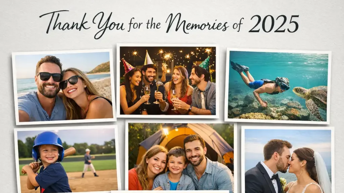 Create a digital New Year card designed as a photo collage featuring multiple rectangular photo frames arranged neatly on a neutral background. Add soft drop shadows under each image. At the top, include text reading “Thank You for the Memories of 2025”, and at the bottom add “Here’s to an even better 2026” in clean modern typography. Use aspect ratio 3:4.