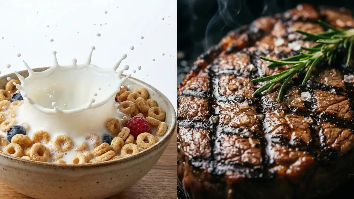Create a dynamic macro photo of milk splashing into a bowl of cereal, freezing the motion of the white liquid crown and droplets, capturing the texture of the toasted grain loops, high-speed photography style, bright lighting, use aspect ratio 1:1.