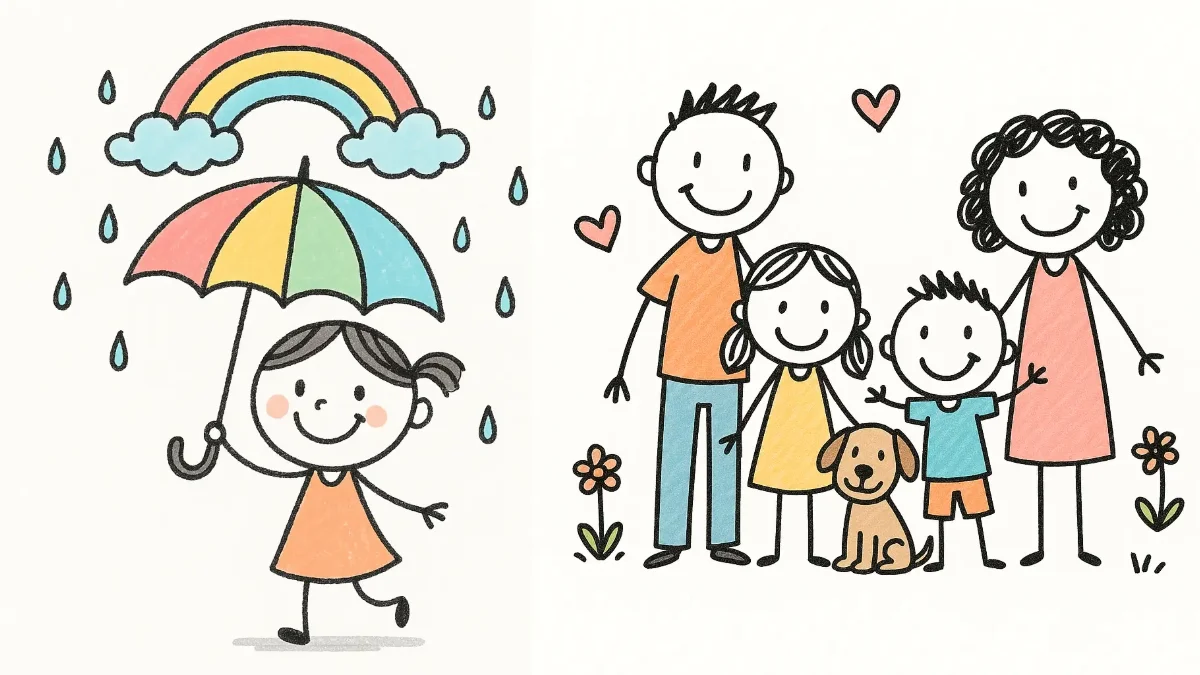 Create a Cute Hand-Drawn Doodle sticker from the uploaded photo of the person in the photo. The sticker should have a simplified, charmingly imperfect look with a smiling face and a simple, primary color palette. It needs to have sketchy, pencil-like outlines and messy, scribbled-in color shading, all on a plain white background.